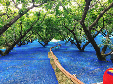 毎年6月頃梅の収穫を行いますが、収穫するまで1年間梅の世話をしています。春と秋に有機肥料をまき、冬は梅の木の選定を行います。5月には自然落下した梅が直接地面につかないよう畑一面に青いネットを敷きます。6月には山一面が青くなる風景が見え、畑一面に南高梅の甘い香りが漂います。そして梅の収穫が始まります。